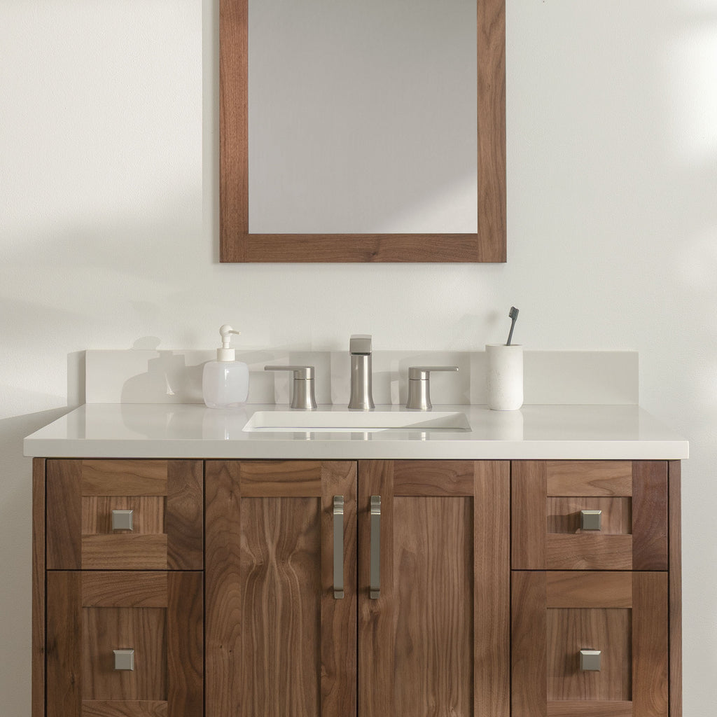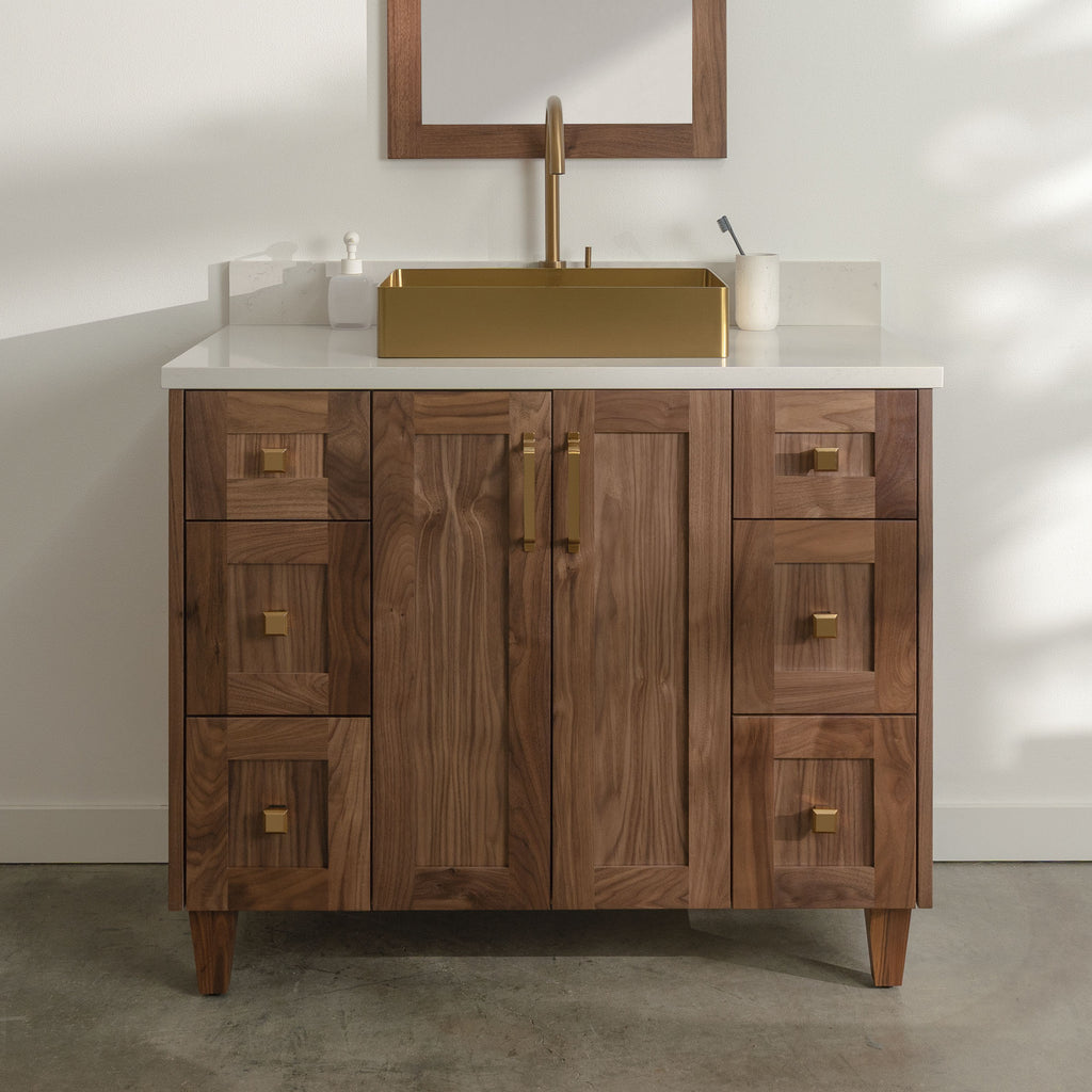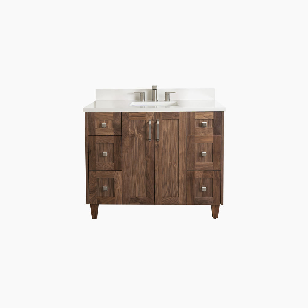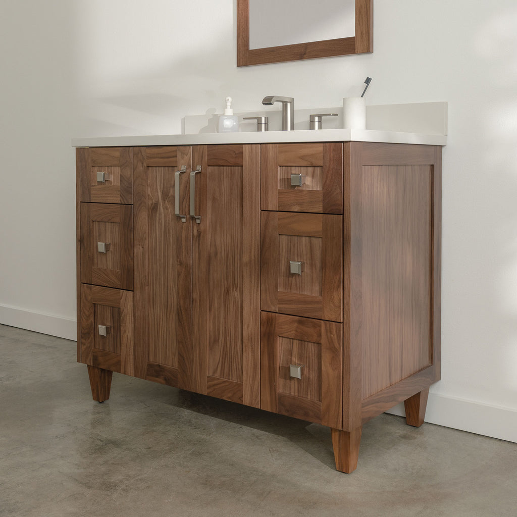 Bridgeport 42" American Black Walnut Bathroom Vanity from Canadian made Teodor® vanities. Transitional beauty enters your bath space with full walnut shaker fronts and sides and tapered solid walnut legs. These well made vanities feature solid wood and wood veneer over plywood construction. Top of the line hardware and soft closing, full extension drawer sliders as well as BLUM® 110° full overlay hinges. Intricate dovetail drawer box design, and a wide selection of beautiful finishes and stone tops.
