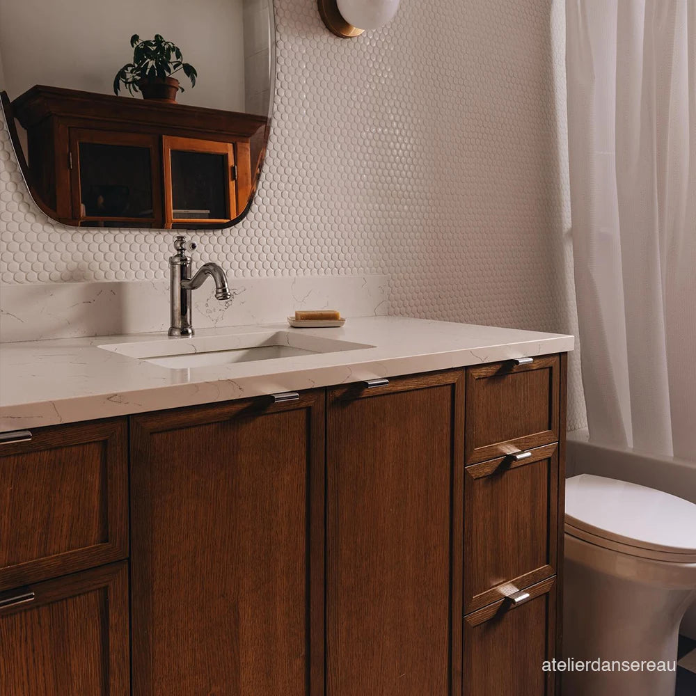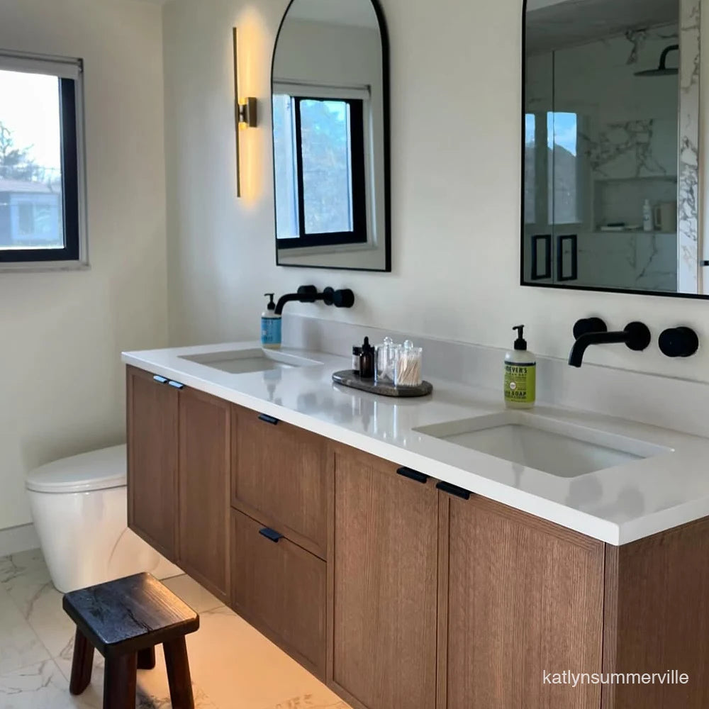 Each vanity is paired with a solid 3 cm slab of durable quartz,