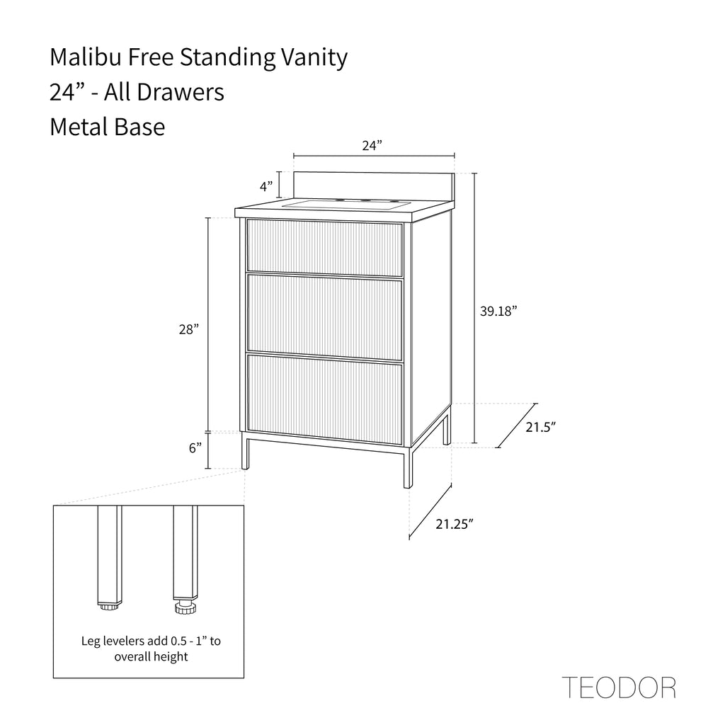 Malibu 24" American Black Walnut Bathroom Vanity from Canadian made Teodor® vanities. Full walnut reeded fronts with tapered solid walnut legs. These well made vanities feature solid wood and wood veneer over plywood construction. Top of the line hardware and soft closing, full extension drawer sliders. Intricate dovetail drawer box design, and a wide selection of beautiful finishes and stone tops.