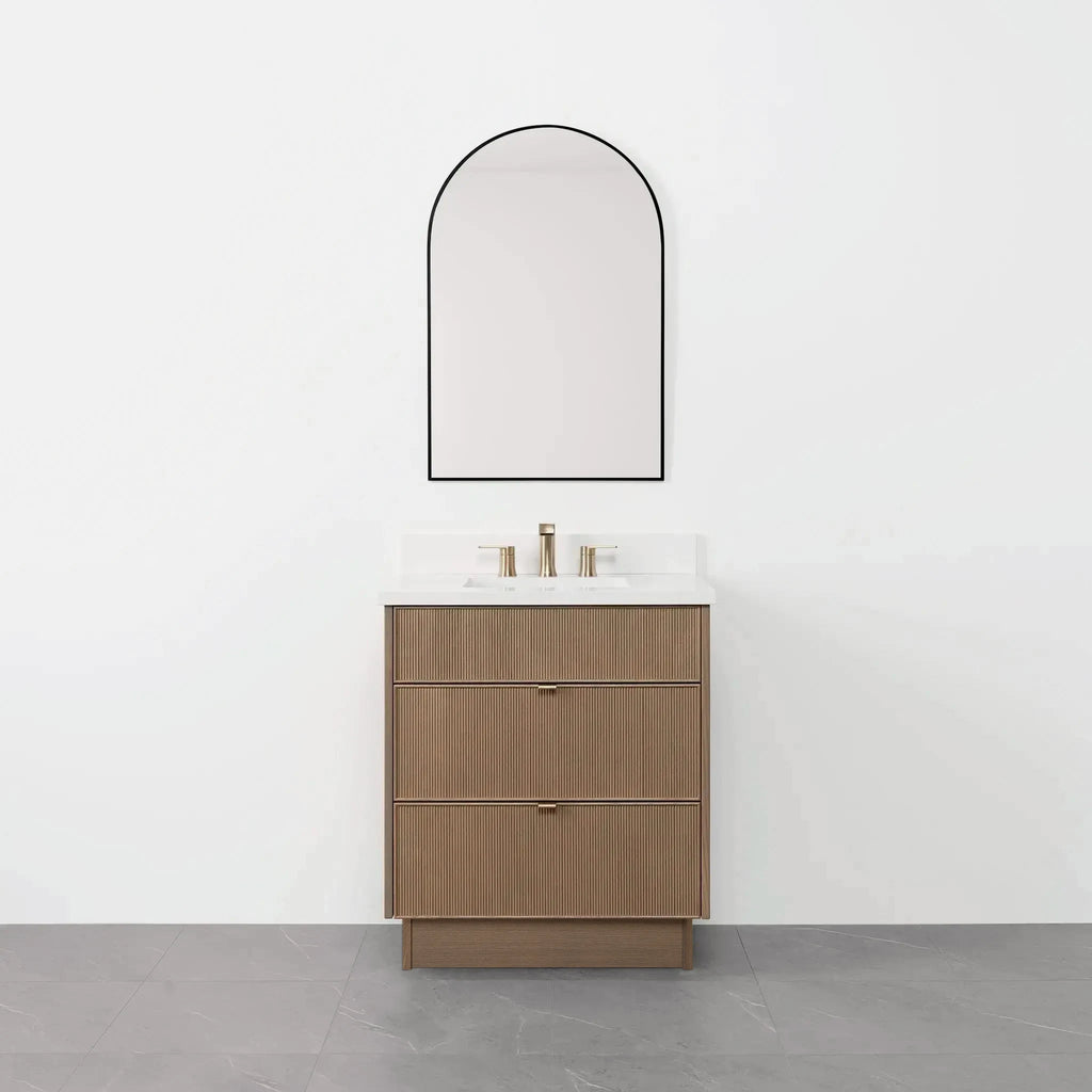 Malibu 30" Almond Coast Bathroom Vanity from Canadian made Teodor® vanities. Full oak reeded fronts and tapered solid oak legs. These well made vanities feature solid wood and wood veneer over plywood construction. Top of the line hardware and soft closing, full extension drawer sliders. Intricate dovetail drawer box design, and a wide selection of beautiful finishes and stone tops.