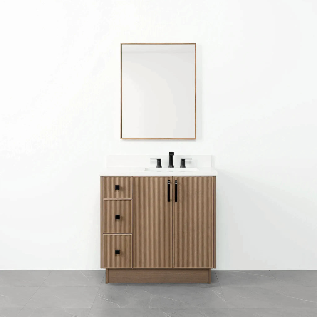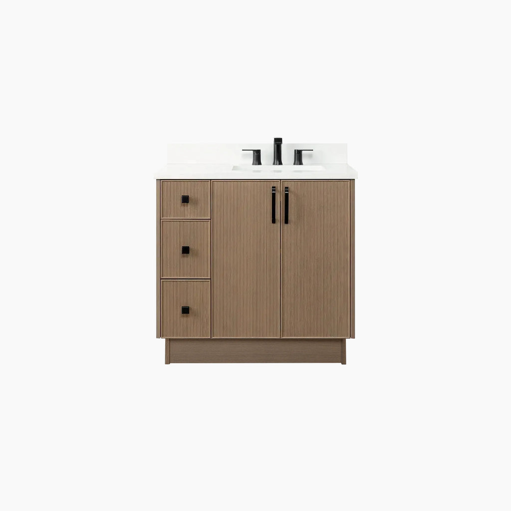Malibu 36" Almond Coast Bathroom Vanity, Right Sink from Canadian made Teodor® vanities. Full oak reeded fronts and tapered solid oak legs. These well made vanities feature solid wood and wood veneer over plywood construction. Top of the line hardware and soft closing, full extension drawer sliders as well as BLUM® 110° full overlay hinges. Intricate dovetail drawer box design, and a wide selection of beautiful finishes and stone tops.
