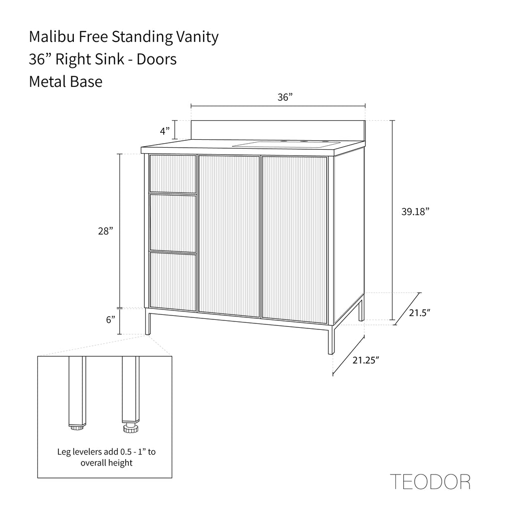 Malibu 36" American Black Walnut Bathroom Vanity, Right Sink from Canadian made Teodor® vanities. Full walnut reeded fronts and tapered solid walnut legs. These well made vanities feature solid wood and wood veneer over plywood construction. Top of the line hardware and soft closing, full extension drawer sliders as well as BLUM® 110° full overlay hinges. Intricate dovetail drawer box design, and a wide selection of beautiful finishes and stone tops.