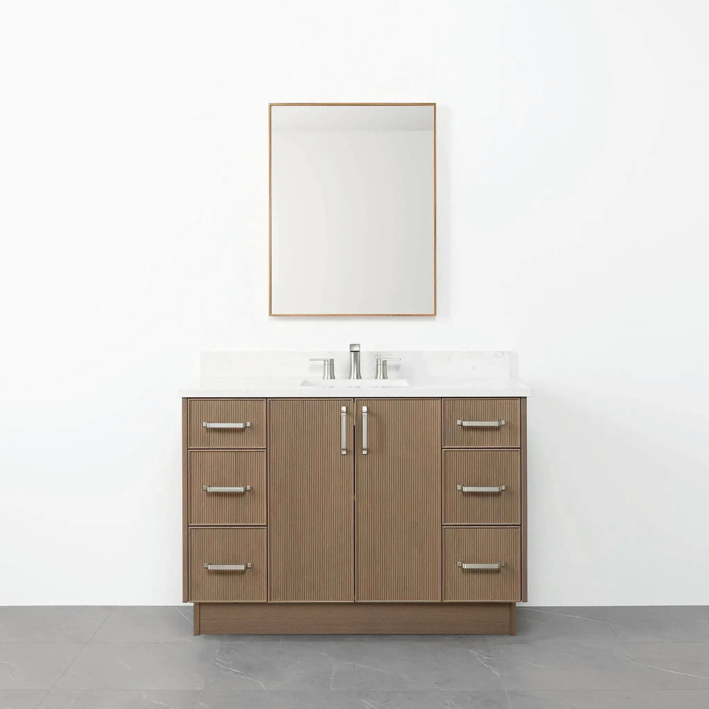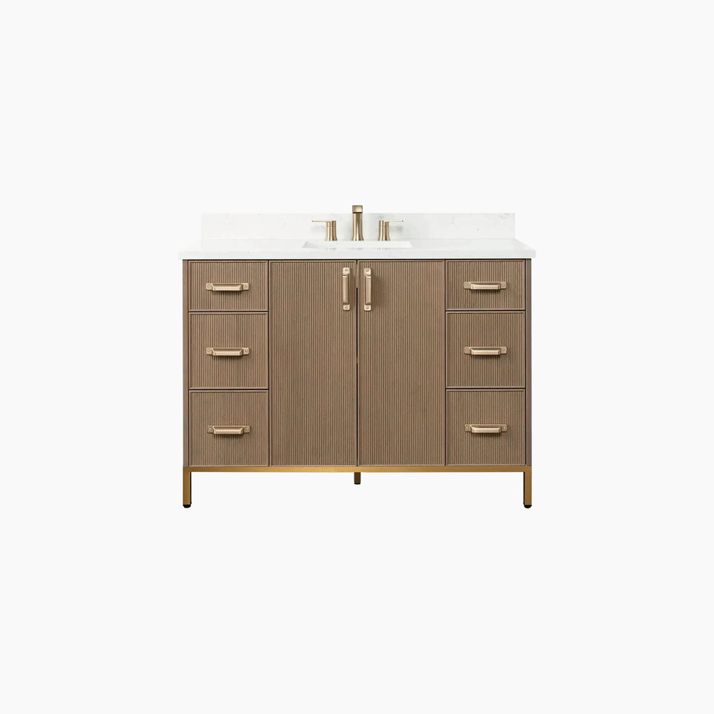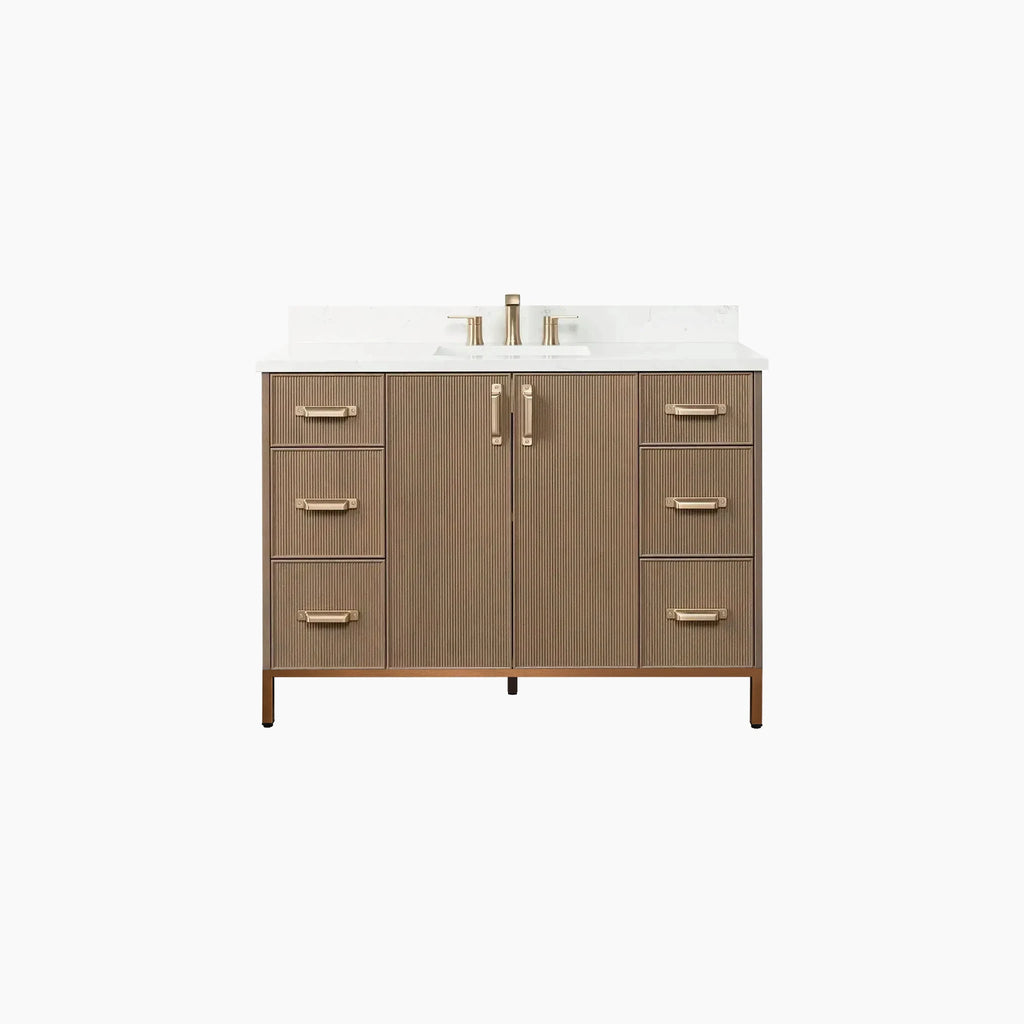 Malibu 48" Almond Coast Bathroom Vanity from Canadian made Teodor® vanities. Full oak reeded fronts and tapered solid oak legs. These well made vanities feature solid wood and wood veneer over plywood construction. Top of the line hardware and soft closing, full extension drawer sliders as well as BLUM® 110° full overlay hinges. Intricate dovetail drawer box design, and a wide selection of beautiful finishes and stone tops.