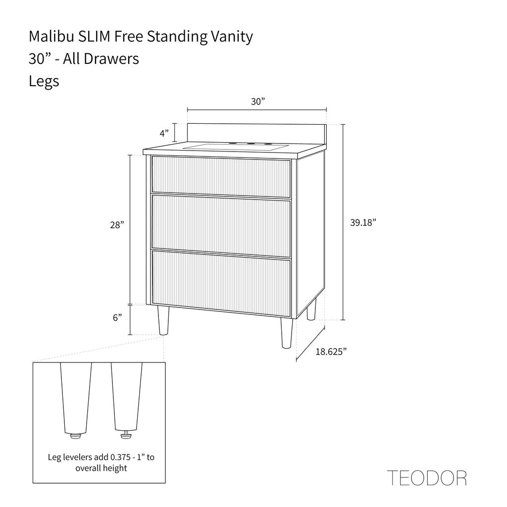 Malibu SLIM 30" American Black Walnut Bathroom Vanity from Canadian made Teodor® vanities. Full walnut reeded fronts and tapered solid walnut legs. These well made vanities feature solid wood and wood veneer over plywood construction. Top of the line hardware and soft closing, full extension drawer sliders. Intricate dovetail drawer box design, and a wide selection of beautiful finishes and stone tops.