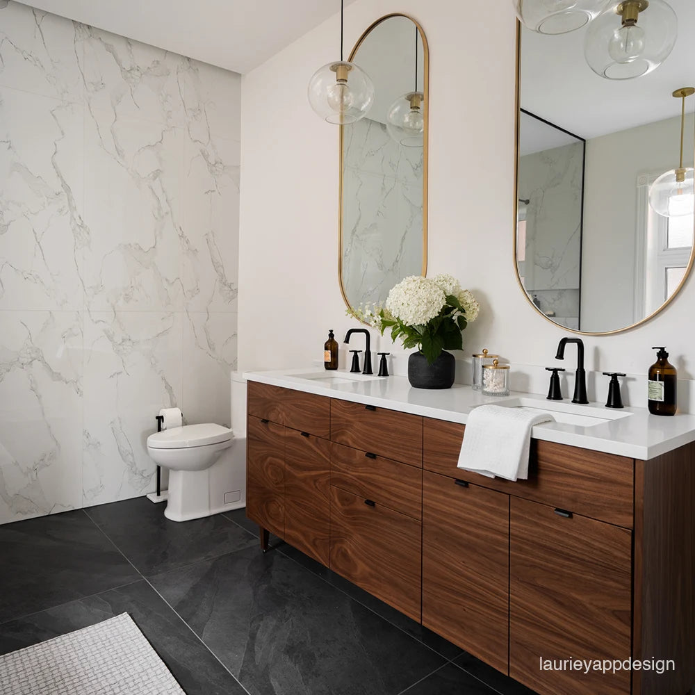 Each vanity is paired with a solid 3 cm slab of durable quartz,