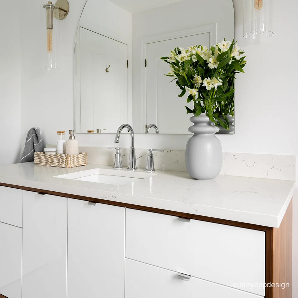 Each vanity is paired with a solid 3 cm slab of durable quartz,