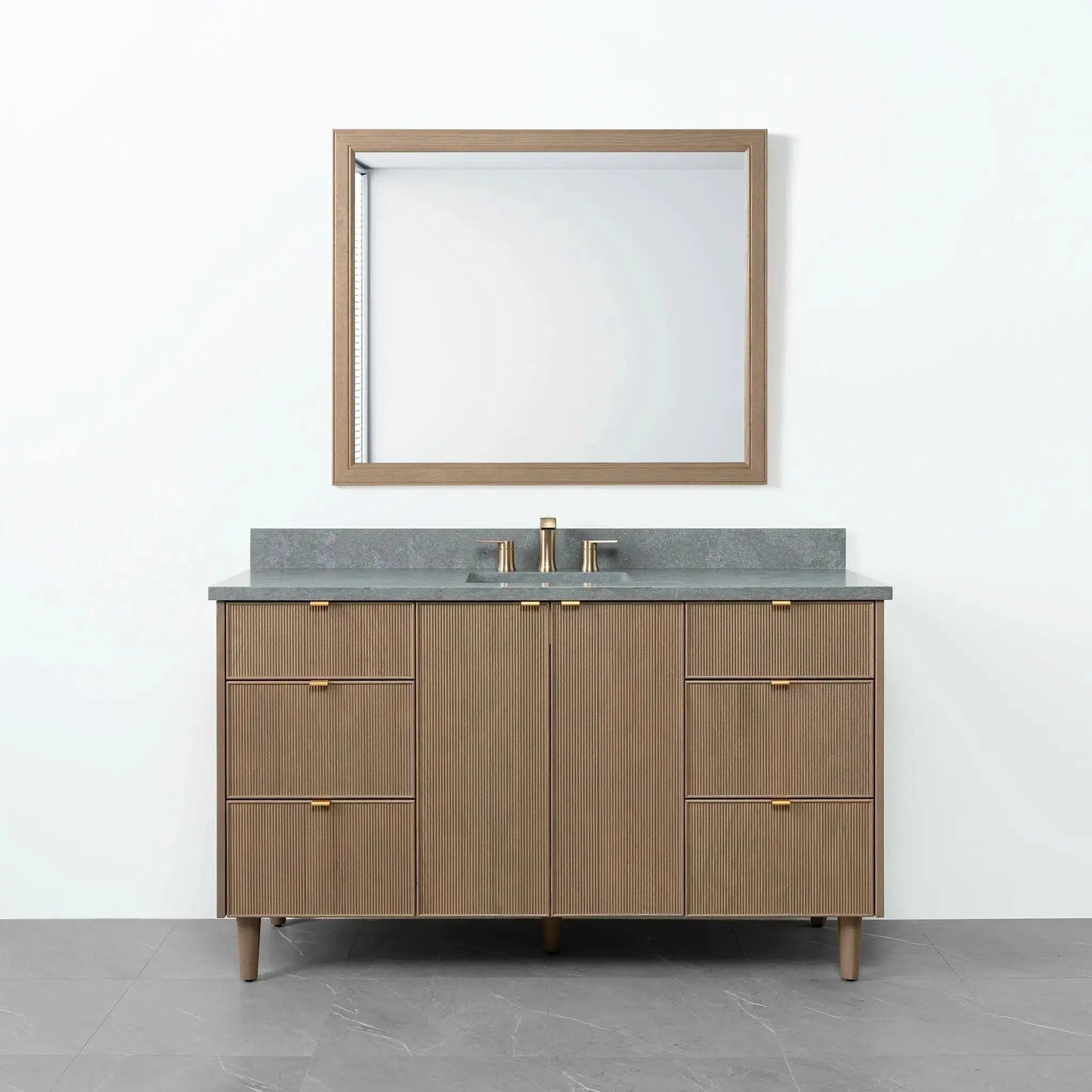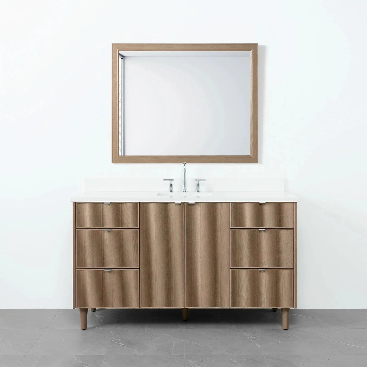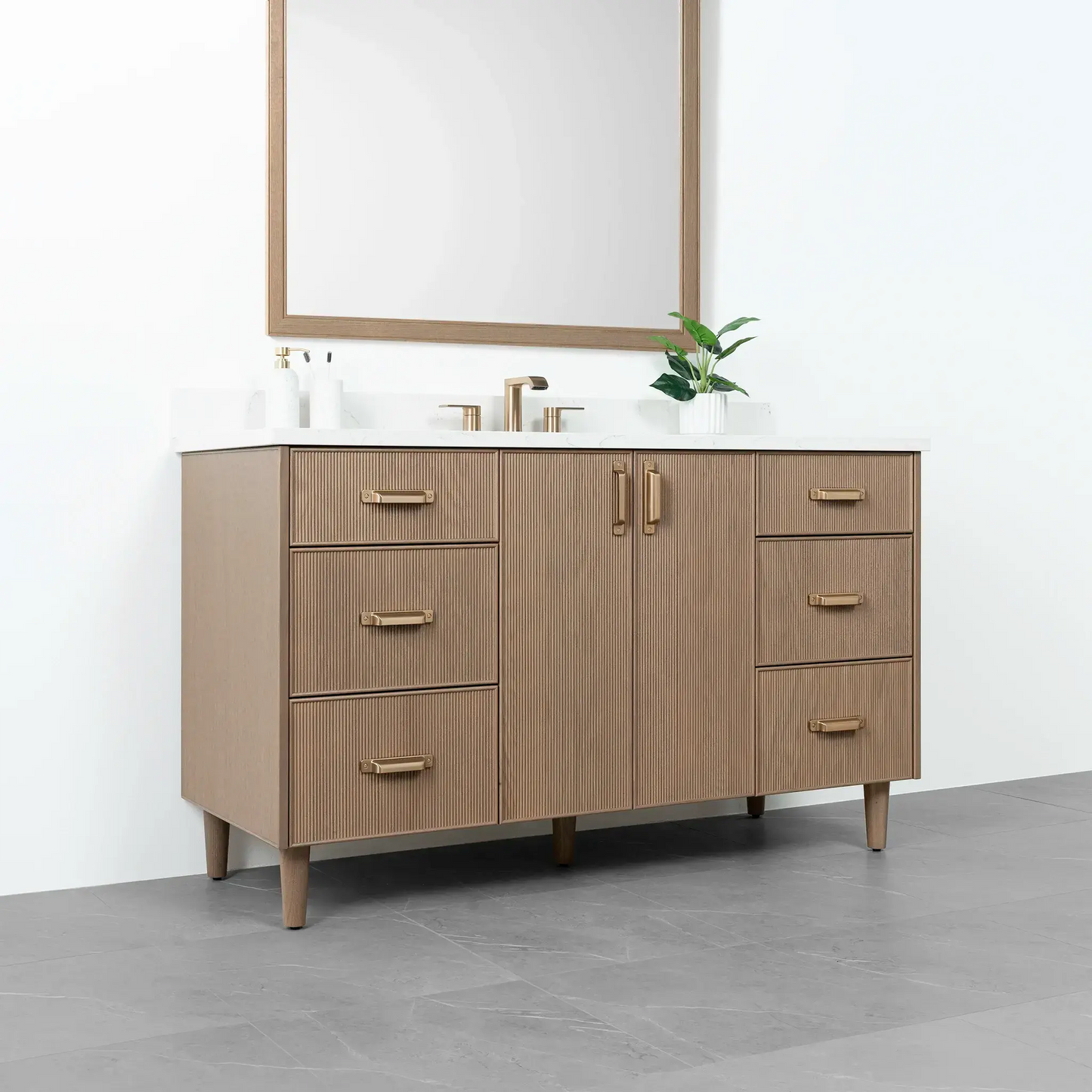 Malibu SLIM 60" Almond Coast Bathroom Vanity from Canadian made Teodor® vanities. Full oak reeded fronts and tapered solid oak legs. These well made vanities feature solid wood and wood veneer over plywood construction. Top of the line hardware and soft closing, full extension drawer sliders as well as BLUM® 110° full overlay hinges. Intricate dovetail drawer box design, and a wide selection of beautiful finishes and stone tops.