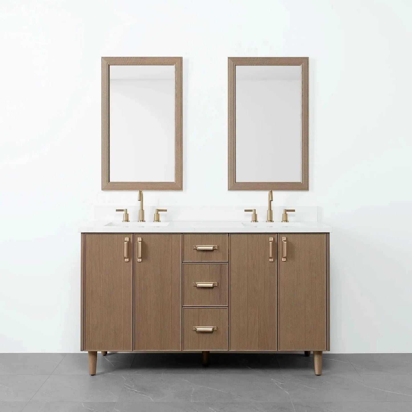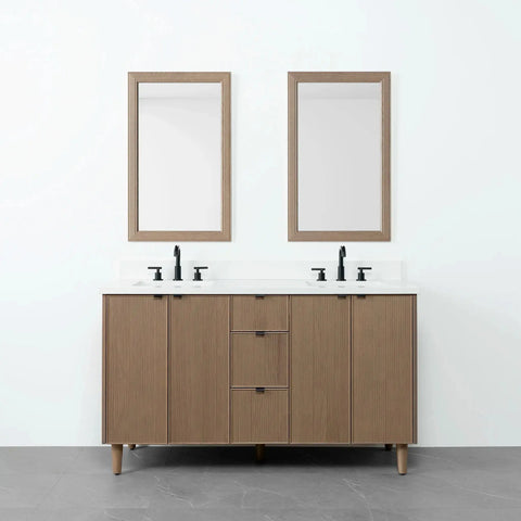 Malibu SLIM 60" Almond Coast Bathroom Vanity, Double Sink from Canadian made Teodor® vanities. Full oak reeded fronts and tapered solid oak legs. These well made vanities feature solid wood and wood veneer over plywood construction. Top of the line hardware and soft closing, full extension drawer sliders as well as BLUM® 110° full overlay hinges. Intricate dovetail drawer box design, and a wide selection of beautiful finishes and stone tops.