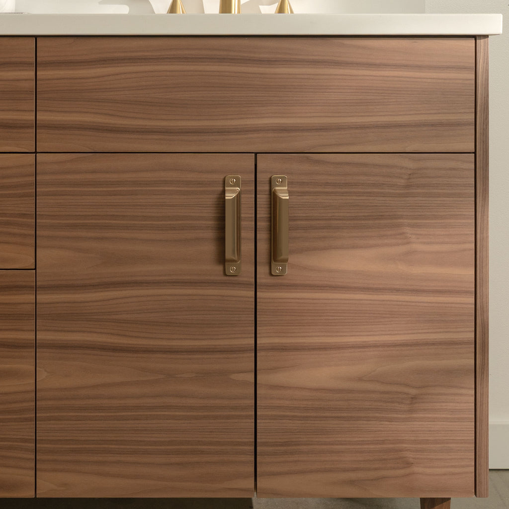 A closer look at the sophisticated design elements of the Austin Stainless American Black Walnut vanity.
