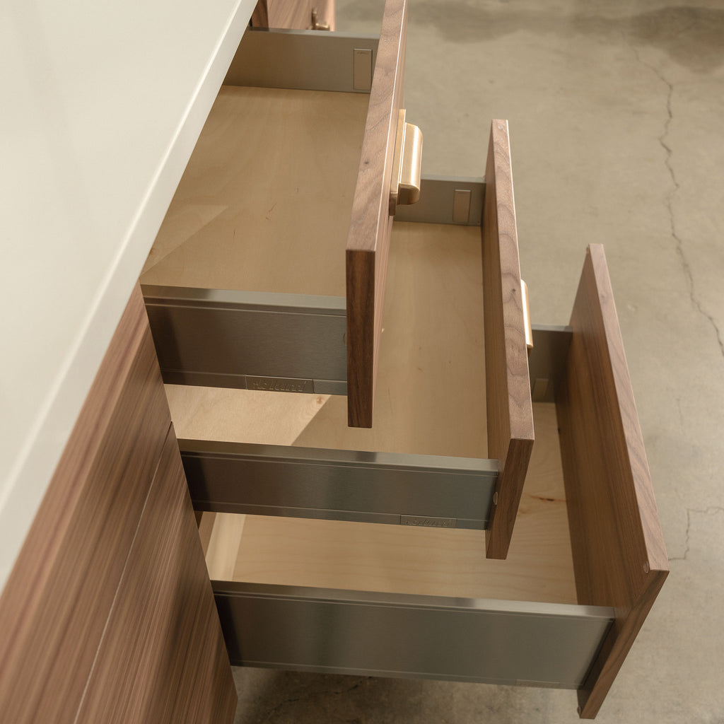The door and drawer fronts are grain matched from one piece of walnut veneer, for a sleek modern look. The grain pattern will flow beautifully from one door to the next.