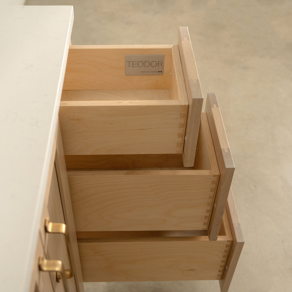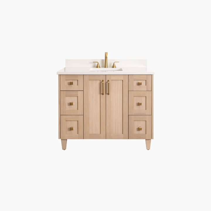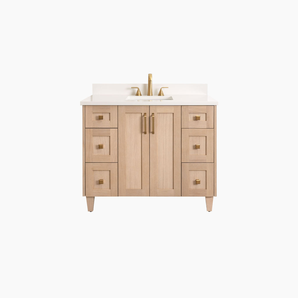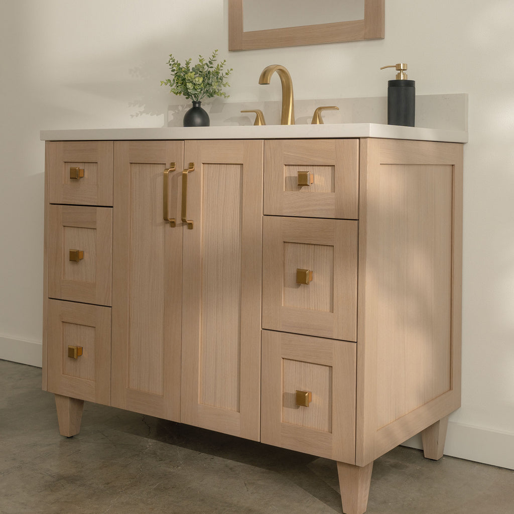 Bridgeport 42" White Oak Bathroom Vanity from Canadian made Teodor® vanities. Transitional beauty enters your bath space with full oak shaker fronts and sides and tapered solid oak legs. These well made vanities feature solid wood and wood veneer over plywood construction. Top of the line hardware and soft closing, full extension drawer sliders as well as BLUM® 110° full overlay hinges. Intricate dovetail drawer box design, and a wide selection of beautiful finishes and stone tops.