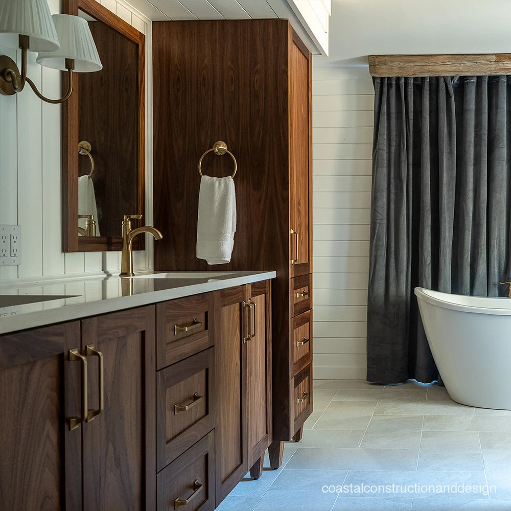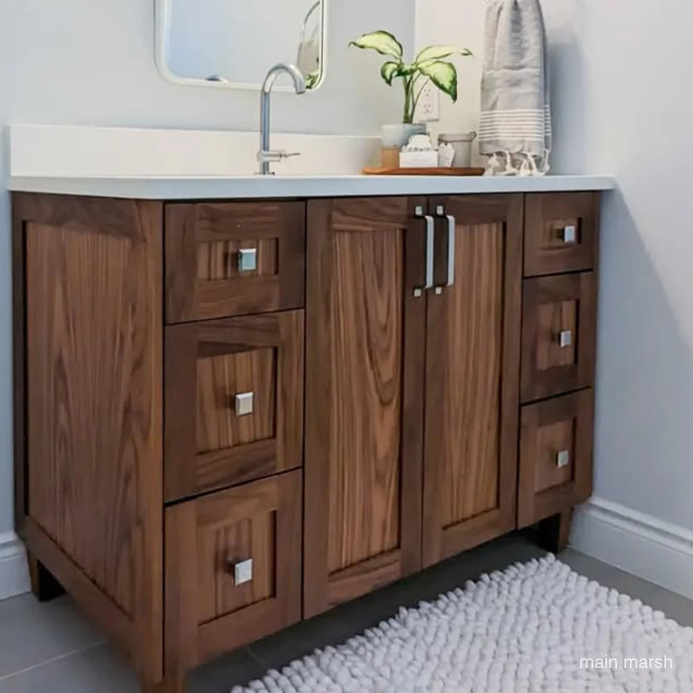 Bridgeport 72" American Black Walnut Bathroom Vanity, Double Sink from Canadian made Teodor® vanities. Transitional beauty enters your bath space with full walnut shaker fronts and sides and tapered solid walnut legs. These well made vanities feature solid wood and wood veneer over plywood construction. Top of the line hardware and soft closing, full extension drawer sliders as well as BLUM® 110° full overlay hinges. Intricate dovetail drawer box design, and a wide selection of beautiful finishes and stone tops.