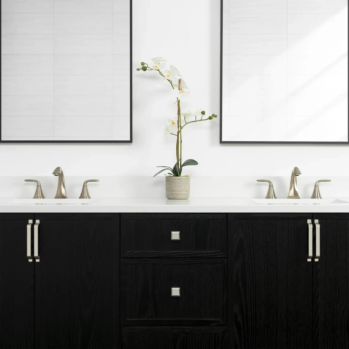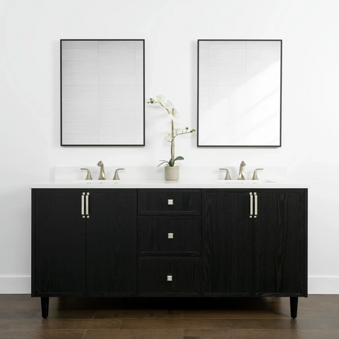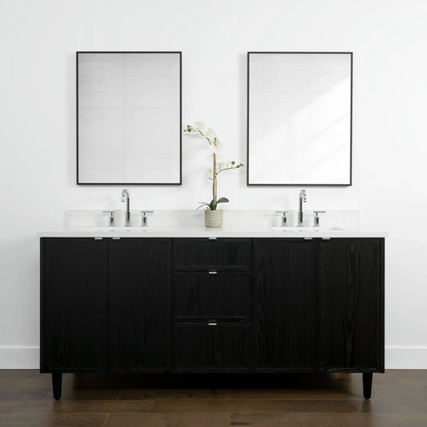 Each vanity is paired with a solid 3 cm slab of durable quartz,